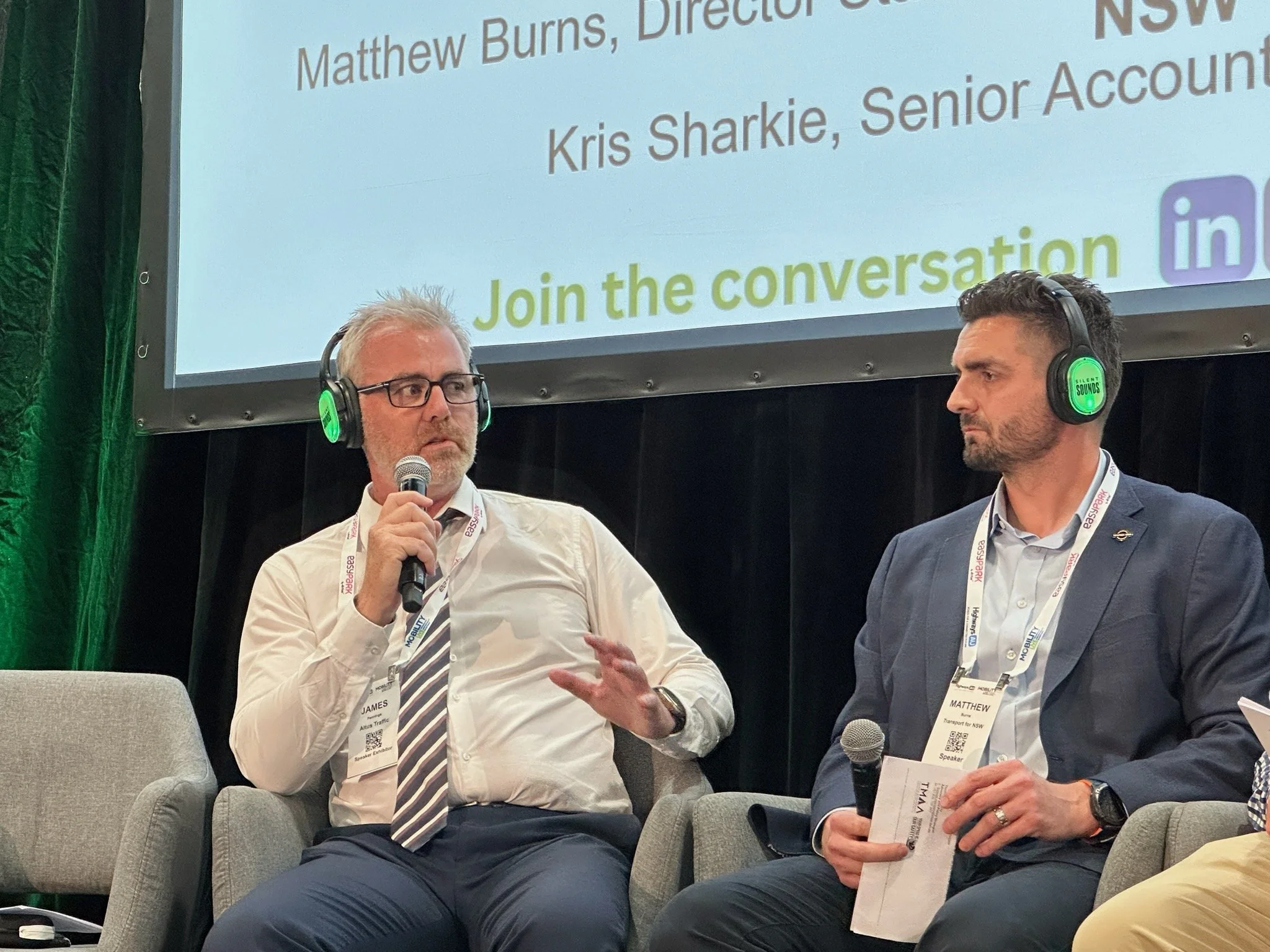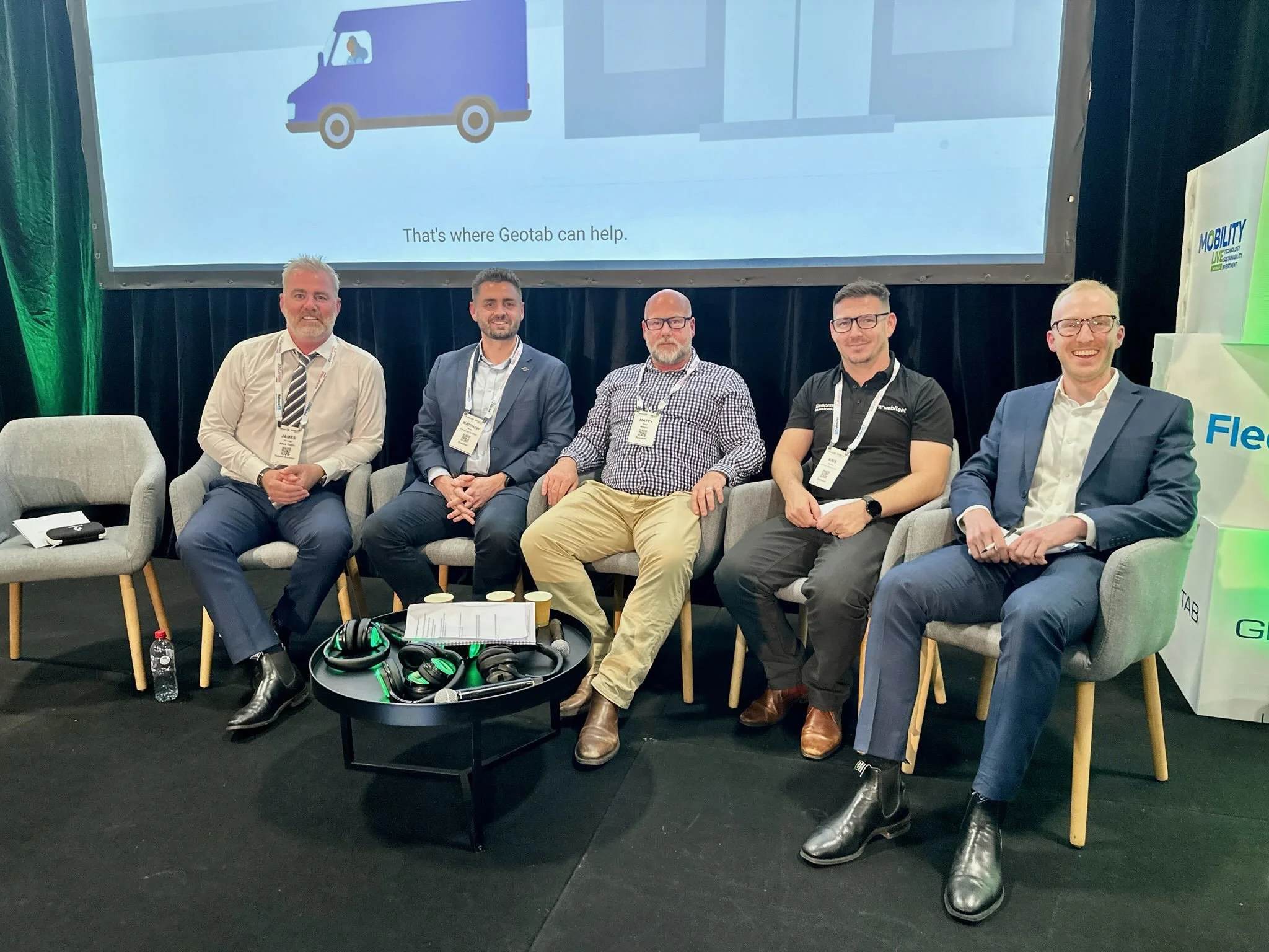 L to R: James Pennings - Chief Commercial Officer, Altus Group. Matthew Burns - Director, Statewide Maintenance & Delivery, Transport for NSW. Matty Maher - Owner & Managing Director, MIEPOL. Kris Sharkey - Senior Account Executive, Webfleet. Thomas Morrissy - TMAA Advocacy and Policy Strategist.